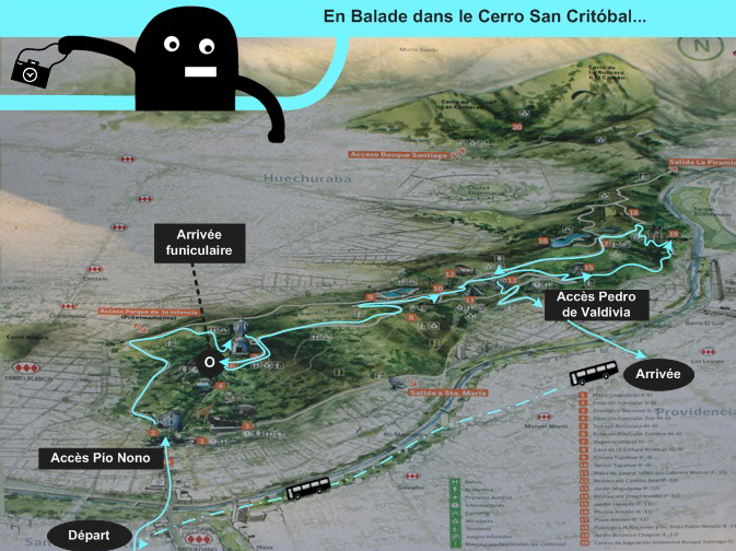 Je vous propose une nouvelle aventure dans le Cerro Santa Lucia près de chez moi… Vous devez trouver des indices cachés dans ce parc pour constituer la phrase magique. Je vous préviens, la route est longue et pentue !