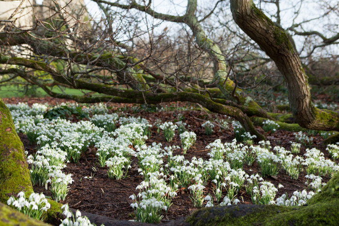 Le château de type anglais se cache derrière un arbre centenaire et ses petits perce-neige...